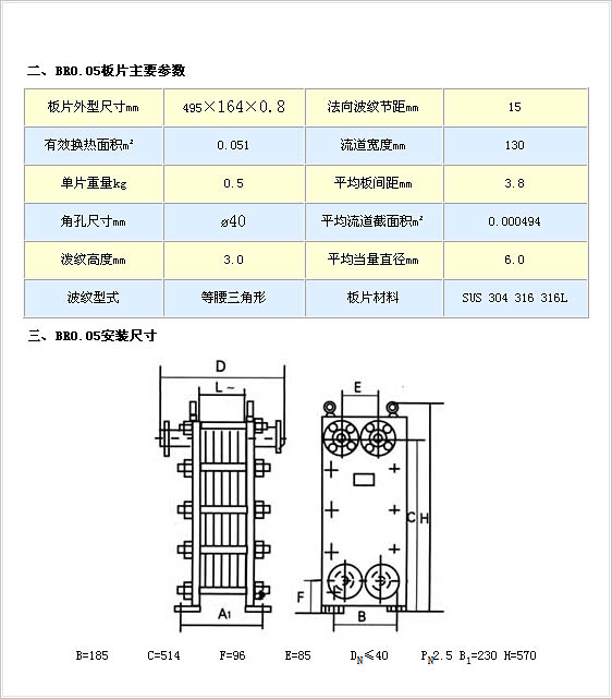 BR0.05型板式換熱器主要由不銹鋼壓制的傳熱片、密封膠墊、夾緊螺栓和壓緊板整機框架等零部件組成。可耐各種腐蝕介質。傳熱效率高,冷熱介質通過相鄰板片流經各自通道進行換熱。由于板片上有人字形波紋,介質流動形成湍流, 因此獲得較高的換熱效率。高效節能,傳熱系數高。其換熱系數可達3000-4500kcal/m2.゜C.h.是相同流速下管殼式換熱器的3倍以上。使用安全可靠,結構緊湊,體積小,占地少,是同等換熱面積管殼式換熱器的五分之一左右。組合靈活,調整維修方便。松開壓緊螺母即可進行清洗維護,更換膠墊或板片。板式換熱器板片均為獨立元件,可按用戶要求隨意增減換熱面積和流程。密封槽設置泄液液道,各種介質不會串通,即使出現泄漏,也是向外排出。