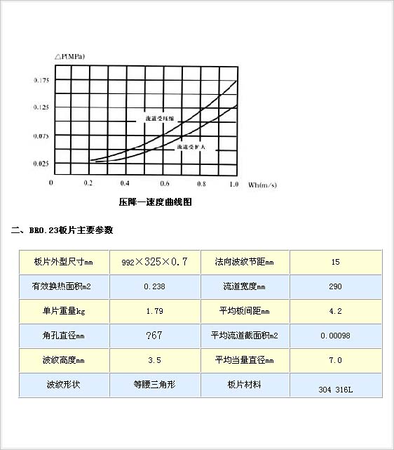 BR0.23型板式換熱器主要由不銹鋼壓制的傳熱片、密封膠墊、夾緊螺栓和壓緊板整機框架等零部件組成。可耐各種腐蝕介質。傳熱效率高,冷熱介質通過相鄰板片流經各自通道進行換熱。由于板片上有人字形波紋,介質流動形成湍流, 因此獲得較高的換熱效率。高效節能,傳熱系數高。其換熱系數可達3000-4500kcal/m2.゜C.h.是相同流速下管殼式換熱器的3倍以上。使用安全可靠,結構緊湊,體積小,占地少,是同等換熱面積管殼式換熱器的五分之一左右。組合靈活,調整維修方便。松開壓緊螺母即可進行清洗維護,更換膠墊或板片。板式換熱器板片均為獨立元件,可按用戶要求隨意增減換熱面積和流程。密封槽設置泄液液道,各種介質不會串通,即使出現泄漏,也是向外排出。
