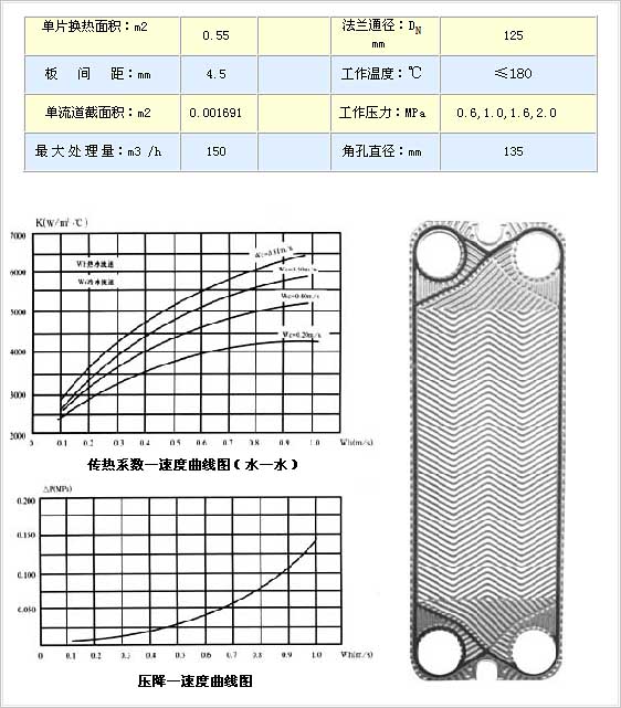 BR0.55型板式換熱器主要由不銹鋼壓制的傳熱片、密封膠墊、夾緊螺栓和壓緊板整機框架等零部件組成?赡透鞣N腐蝕介質。傳熱效率高,冷熱介質通過相鄰板片流經各自通道進行換熱。由于板片上有人字形波紋,介質流動形成湍流, 因此獲得較高的換熱效率。高效節能,傳熱系數高。其換熱系數可達3000-4500kcal/m2.゜C.h.是相同流速下管殼式換熱器的3倍以上。使用安全可靠,結構緊湊,體積小,占地少,是同等換熱面積管殼式換熱器的五分之一左右。組合靈活,調整維修方便。松開壓緊螺母即可進行清洗維護,更換膠墊或板片。板式換熱器板片均為獨立元件,可按用戶要求隨意增減換熱面積和流程。密封槽設置泄液液道,各種介質不會串通,即使出現泄漏,也是向外排出。
